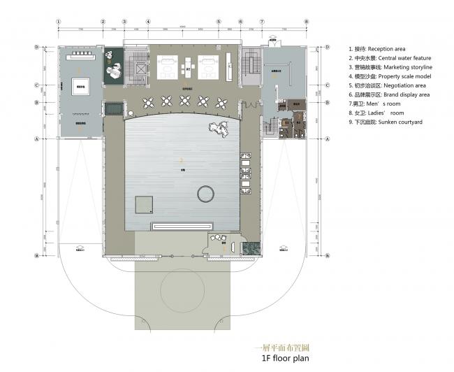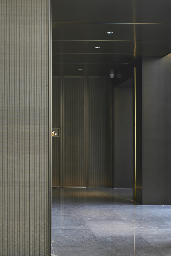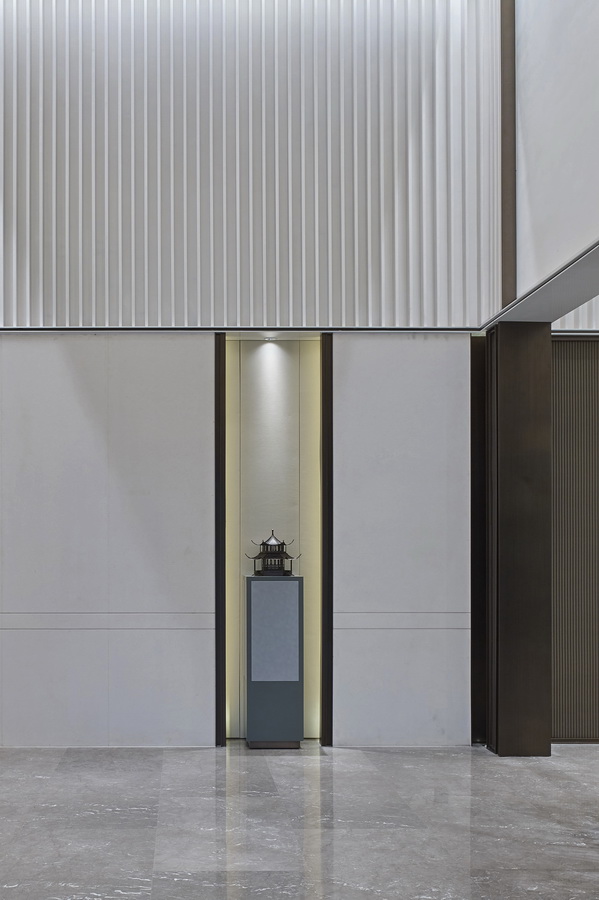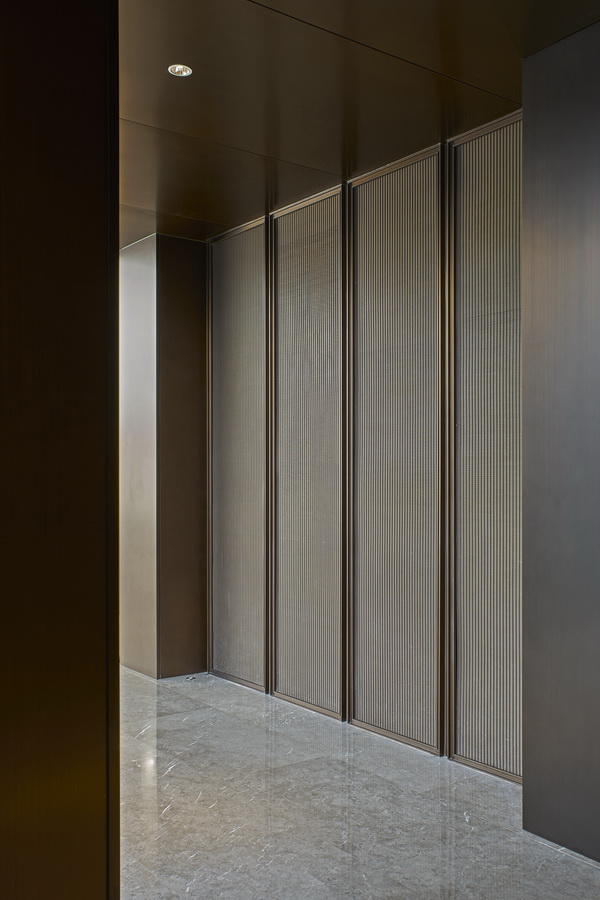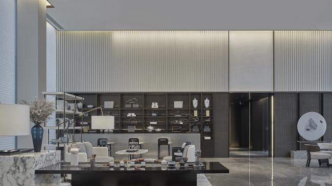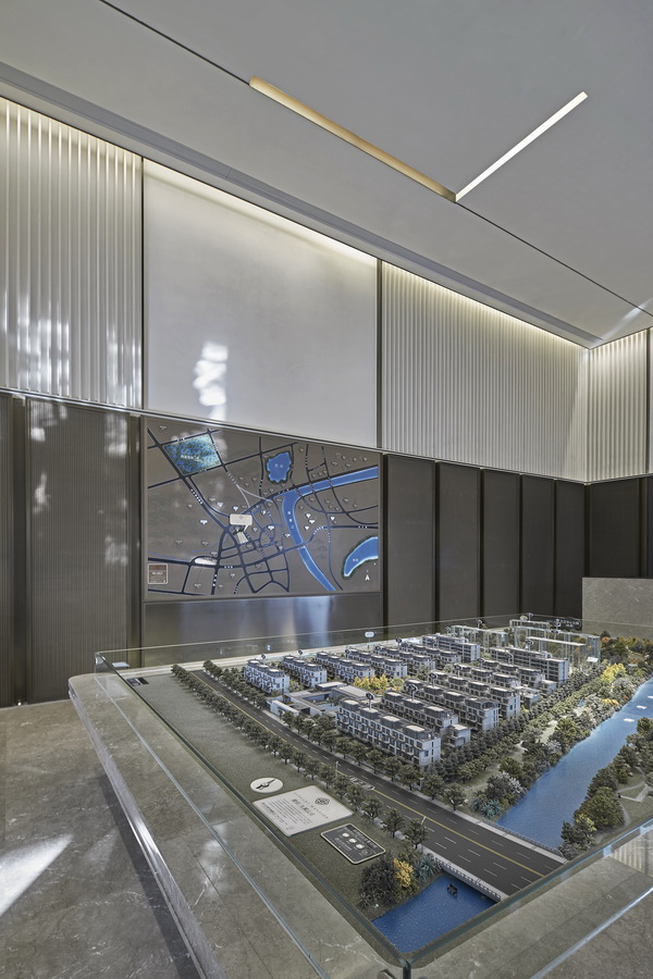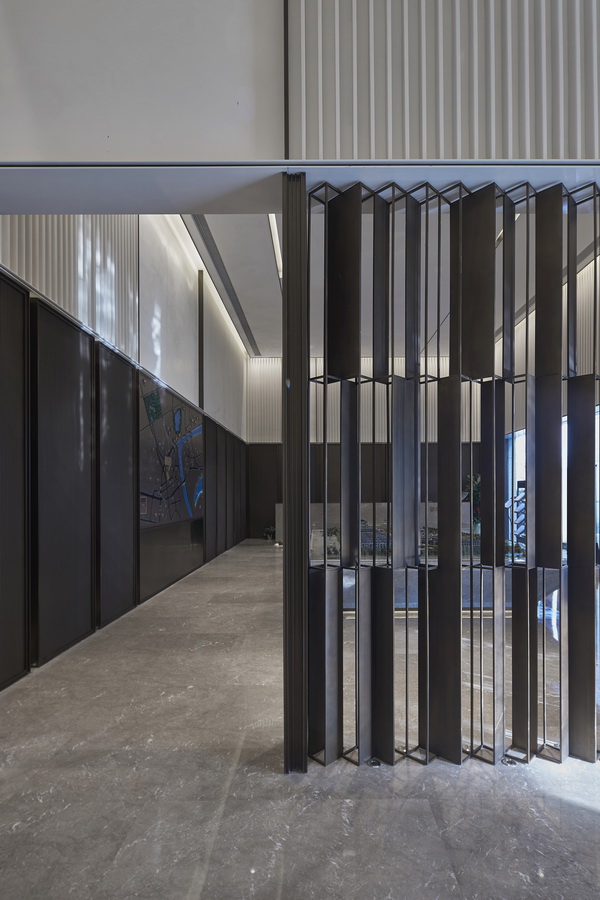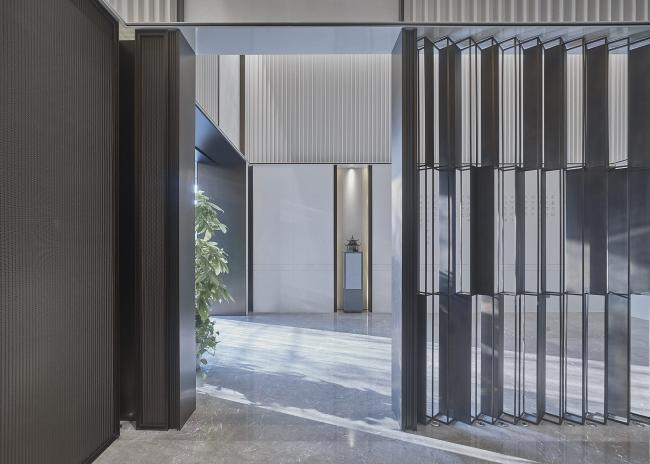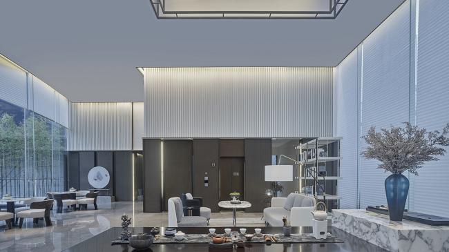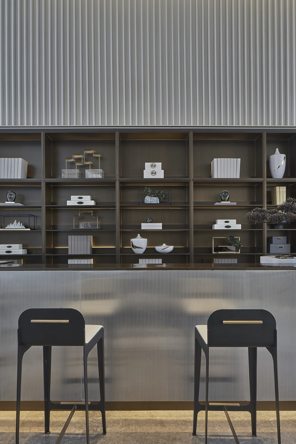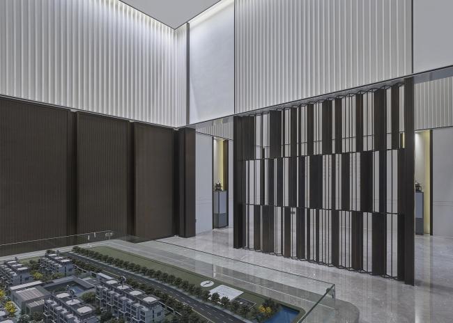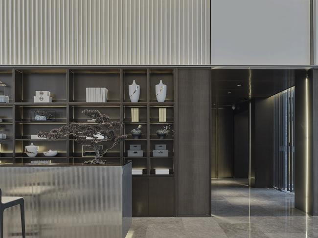 深色木质格栅与大块面的金、银、灰三色搭配,地面依旧是灰色大理石,空间平和且内敛。几何线条的匠心排列,新中式器物适度融合,充满了当代审美的东方韵味。沙盘在此其间,优雅从容。