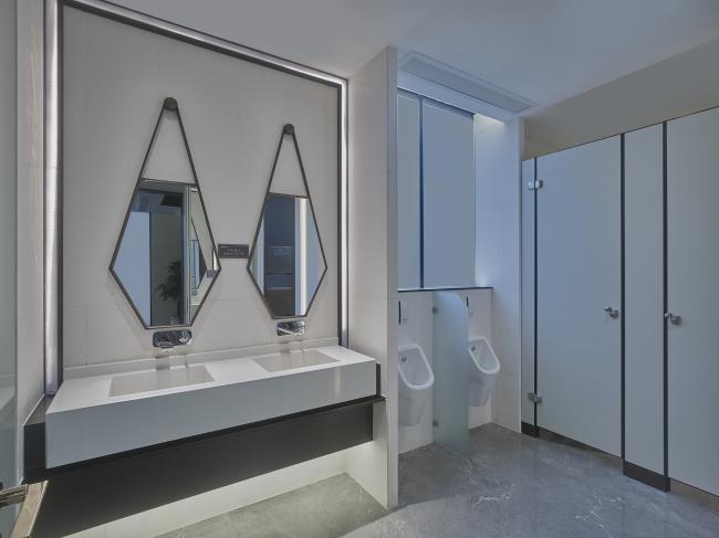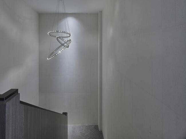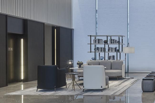 一树、一石,池面如镜。整个庭院在纯粹的线条和层次分明的结构下显得悠然自已,充满禅意的当代极简审美融合进西湖的山色湖光中,宁静而雅趣。镜面水池,以黑金石地砖为材,将空间建构出一种平和的境界,边上的西湖五景,营造出一步一景的视觉体验。与百年树龄的紫微树交相辉映的,是以镜面不锈钢为材质制作的五云山奇石雕塑,背后是玻璃格栅排列而成的亭云画壁,东方语境下的当代呈现。庭院最映入眼帘的是超巨幕弧形玻璃墙,也是生活馆与庭院足以相隔而望的方式。