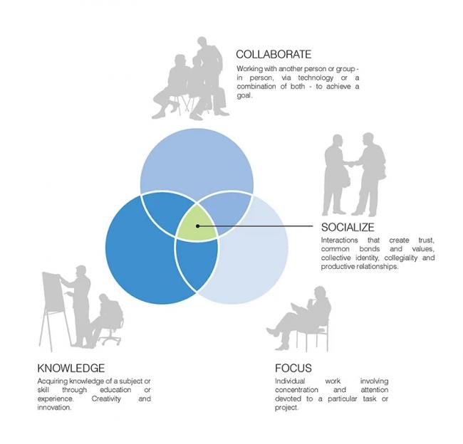 TBC新集会大楼的内部交通空间对互动社会公共领域起到了整合和持续延伸的作用。设计以积极设计和社会可持续性为指导原则,整个部门设置中还融入了银行系统,不同的部门之间通过双层甚至三层通高的社交空间节点进行连接。这些半公共空间在建筑内创造出垂直的空间序列,以便创造出更加灵活和交互性的社交及连接空间。楼梯和交通空间作为工作空间的组成部分,为整座建筑创建了一个具有高度连续感的三维工作流线体系。