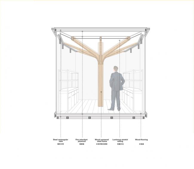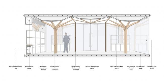 由于下沉广场的特殊位置,建筑体量被限定在了3M*3M*10M的空间内,设计和建造必须在一个多月的时间内完成,而且施工时间被严格限制,所以模块化,预制构件现场组装,成了方案之初的前置条件。