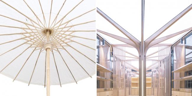 方案采用两个张开的伞架作为支撑结构,整个展售区域就在这伞骨撑起的伞下空间里。伞骨顶部,倾斜的软膜天花罩在伞骨之间,透过灯膜,光线轻柔的洒下来,产生细腻纯净的灯光效果。