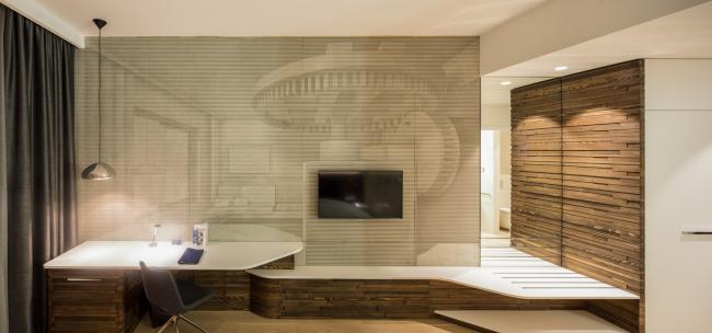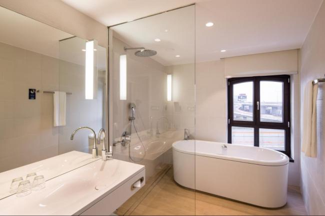 当客人来到一个地势稍高,用旧花岗岩石和老磨房的锻铁列铺设的新广场,会发现水元素隔离了交通噪音,堪称设计之巧妙。大堂给酒店客人以工业的、开放的和真实的氛围。那些从历史建筑提出的砖块等再生材料,被重新清洗、修复和重铺,完全符合可持续发展策略。接待处的背景虽然由旧机器组成,但是却被诠释成了一种现代建筑语言。自然的材料,如橡木和铜,向人们提醒着这个地方的历史。结构上,必要的水泥切口不作任何修饰,补充了整体的工业外观。这些异样的材料和功能与一个巨大的白色结构形成反差,将它们融入了一个连续空间。就像白色帆布背景彰显其不同年代的历史和品质,赋予他们新的生命。