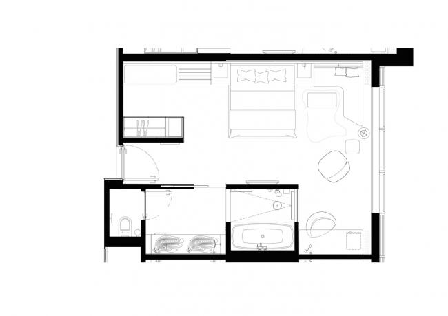 老磨坊这种公共和粗糙的概念也转移到了客房这种私人和柔软的环境中。木材和纺织品的温暖和舒适的质量取代了金属和石制材料。混凝土结构的泥质感作为保持对工业遗产的回忆,机智地以壁画分层作叙事、解释和空间扩展。房间内设有巨大的落地窗、定制的座位区和一个开放明亮的浴室。