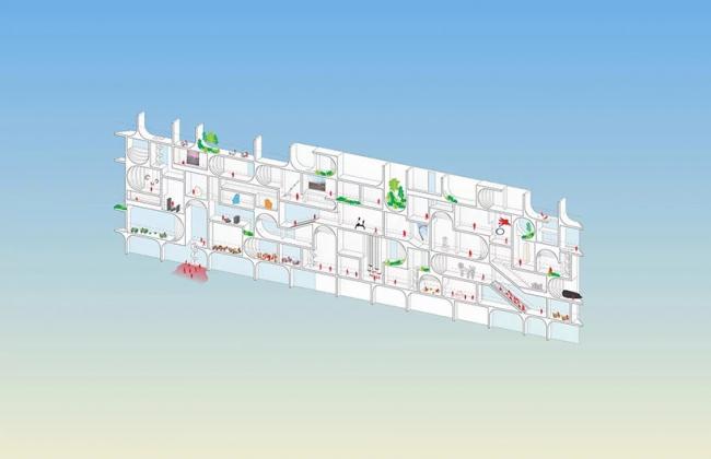在贝鲁特艺术博物馆的设计方案中,灵活的画廊空间得到了完美的空间平衡。外部94个功能房间组成的垂直序列用于新类目艺术品的试用、展示、传播和体验。随着博物馆的扩展,这些室外画廊可以不断演化,它们可以作为遮阳,用来保护内部更加敏感的艺术品,这部分空间甚至可以安装上玻璃以提供额外的室内画廊空间。