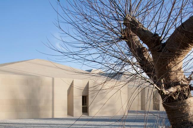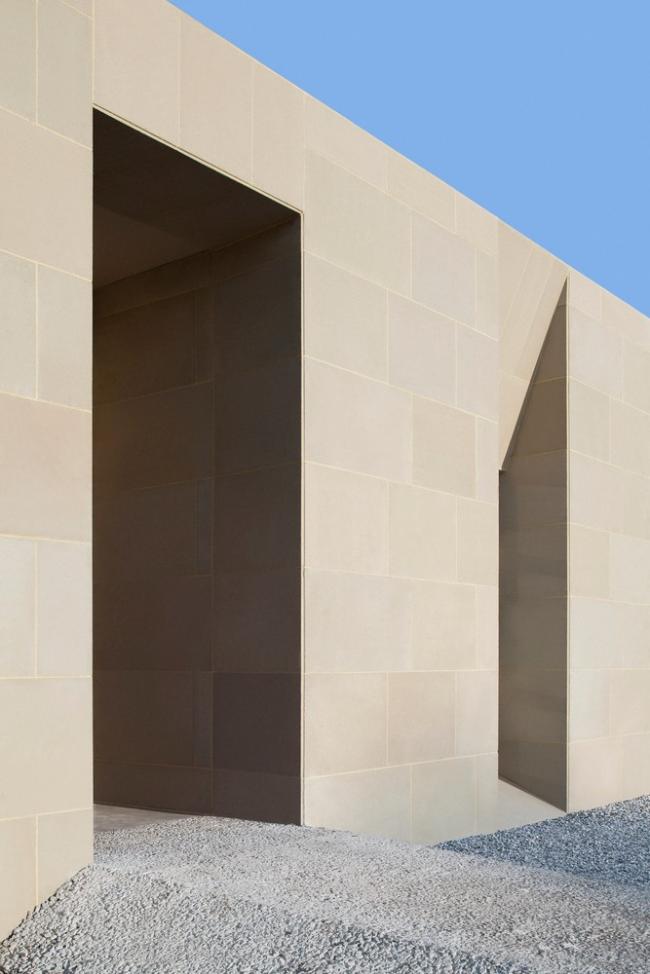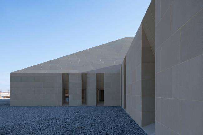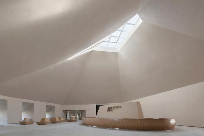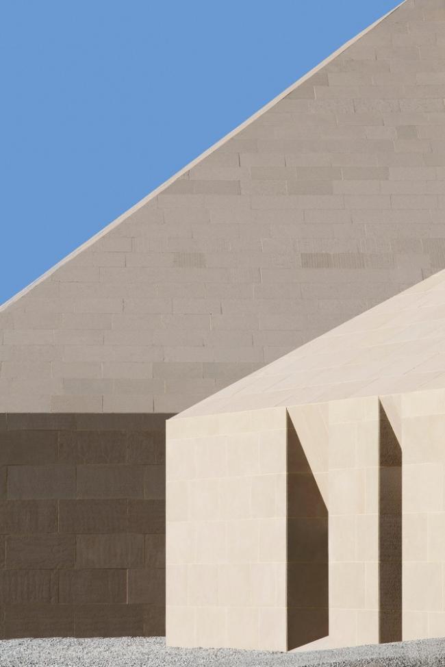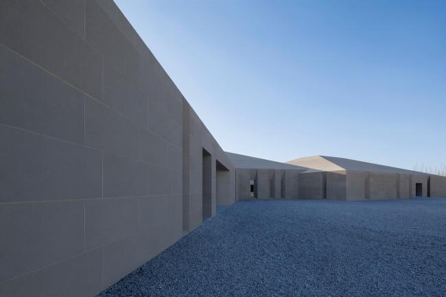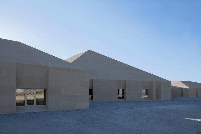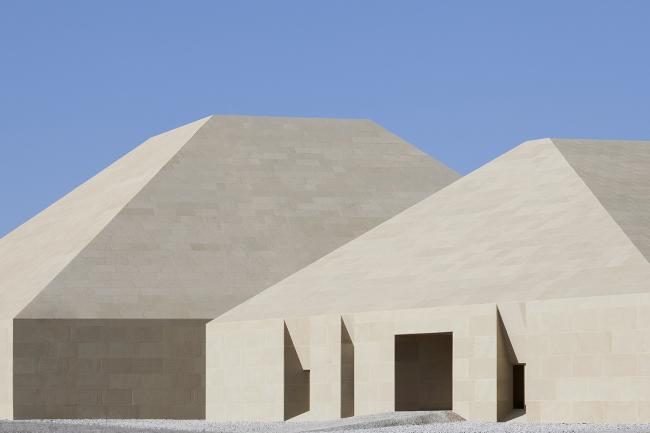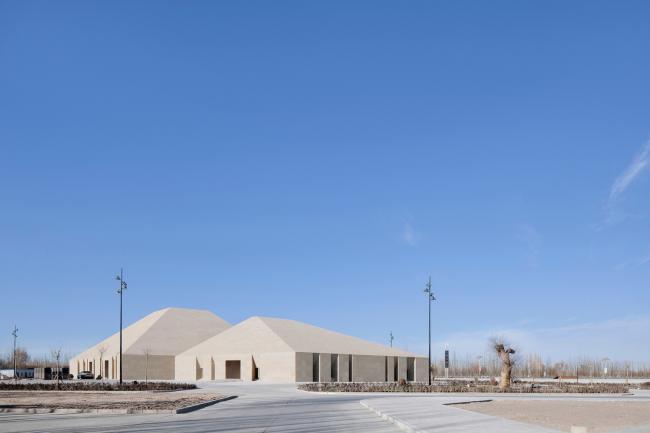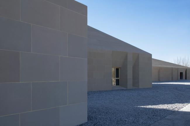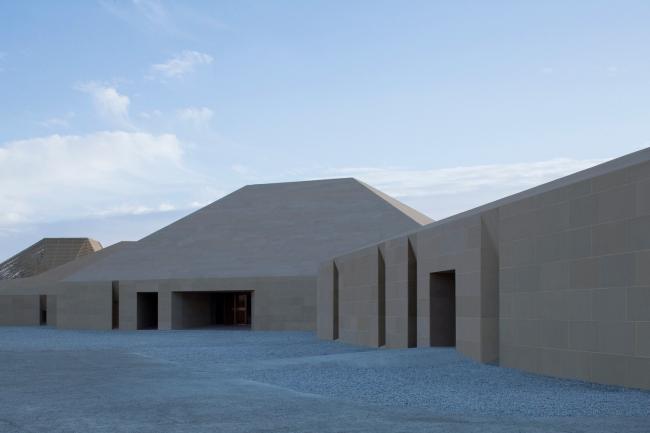 主体建筑根据综合服务、办公后勤、特色餐饮和旅游展示的功能分成四个体块。它们之间相互联系,以半围合的群落式布局,怀抱来自远方的游人。外立面的土黄色石材与当地风貌相呼应。嵌入在厚重石材中的开口,被阳光雕刻出强有力的几何光影。