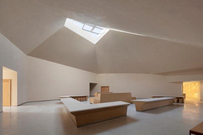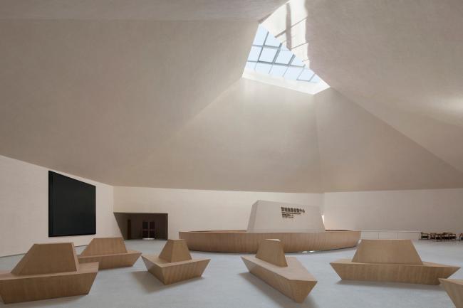 建筑内部,采用类似莫高窟的洞窟式空间体验。在炎炎夏日,游人进入到由大屋顶与厚墙围合而成的大空间,可以在其中休憩。加上透过屋顶与厚墙的阳光,共同营造出身处洞窟之中的感受。这种空间隐喻,既是对当地自然环境的回应,也是对莫高窟(BIM培训)给人的身体经验的重现,最终呈现了敦煌印象。