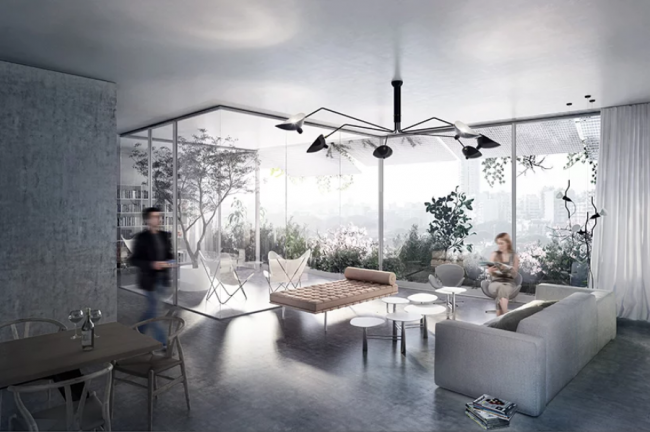 建筑的外立面从地面一直贯通到屋顶,不但在城市天际线的组成建筑中独树一帜,还能够有效模糊掉室内的空间界线。你可以想象一下这里仿佛是一座垂直的花园,各种各样的植被和树木遍布整个住宅单元。整栋建筑内都提供有舒适宜人的环境,户型的空间配置、朝向和大小各不相同,从一间卧室的小单元到三间卧室的大单元都有。