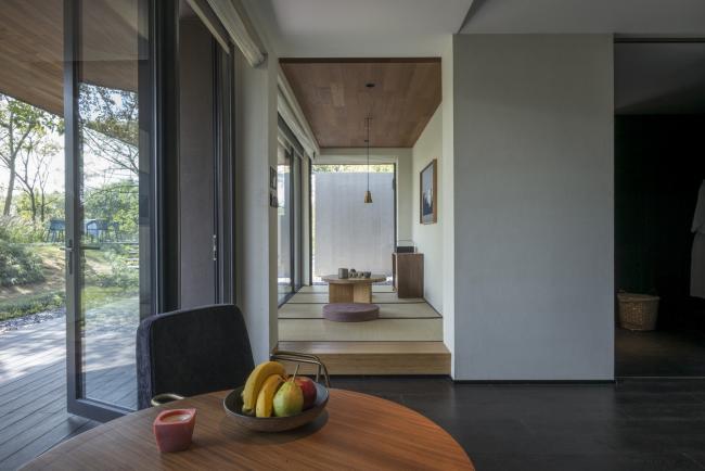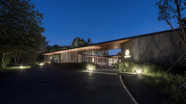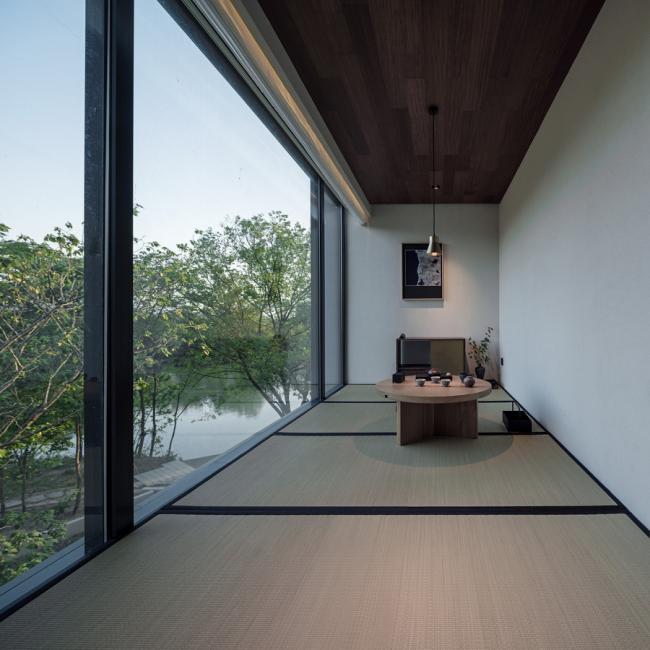 酒店功能布局因地制宜,入口一爿琴台与柿树静立于水院中央,以水平线条连接东侧视野开阔的“野堂”与西侧的回廊。