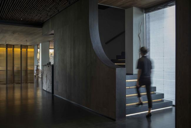 回廊以二度回收的老木板、锈化钢及水冲面大理石作为主材,设计师借此将“时间”的概念引入空间——当材料的原始色泽和触感在风霜雪雨中缓慢演变,时间的流逝也便记录在空间的一石一木之中。