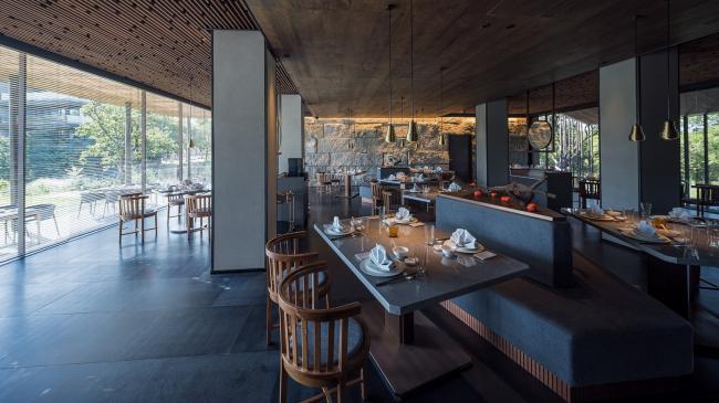 酒店由场地中原有的5栋旧建筑改造而来。如何以生态性最优的方式满足现代酒店的使用需求是建筑师面临的挑战。经过大量的现场调研,建筑师以极小规模的介入完成了结构改造和综合系统布局,使建筑与周边的林木、水系的关系得以延续。
