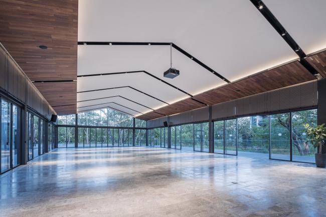全明宴会厅采用270°落地玻璃,逾300㎡室内空间与户外密林、草坪及亲水木平台自然交融,也为在此举办的宴会、服装秀、车展等活动营造出独特的林间体验。