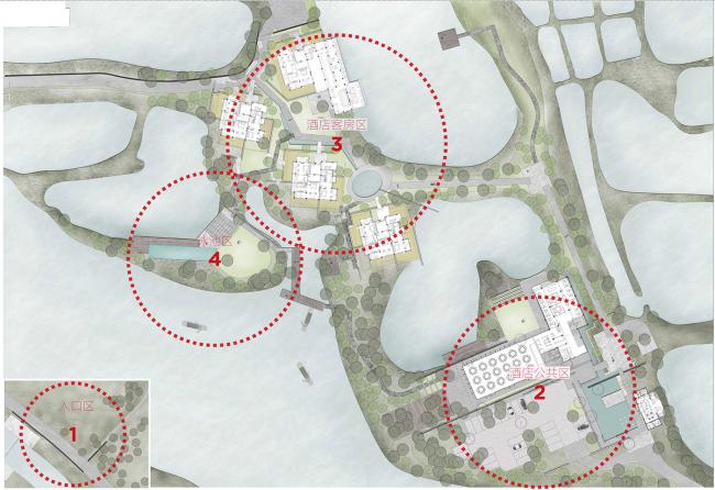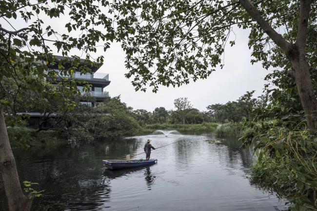 水路流线基于湿地的原始地貌而设计,使习惯了陆上出行的现代人群得以沿古水道前往酒店,在摇橹船徐徐的桨波中,获得观察西溪湿地的另一种视角。