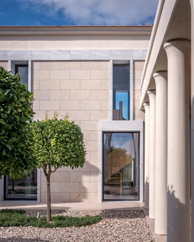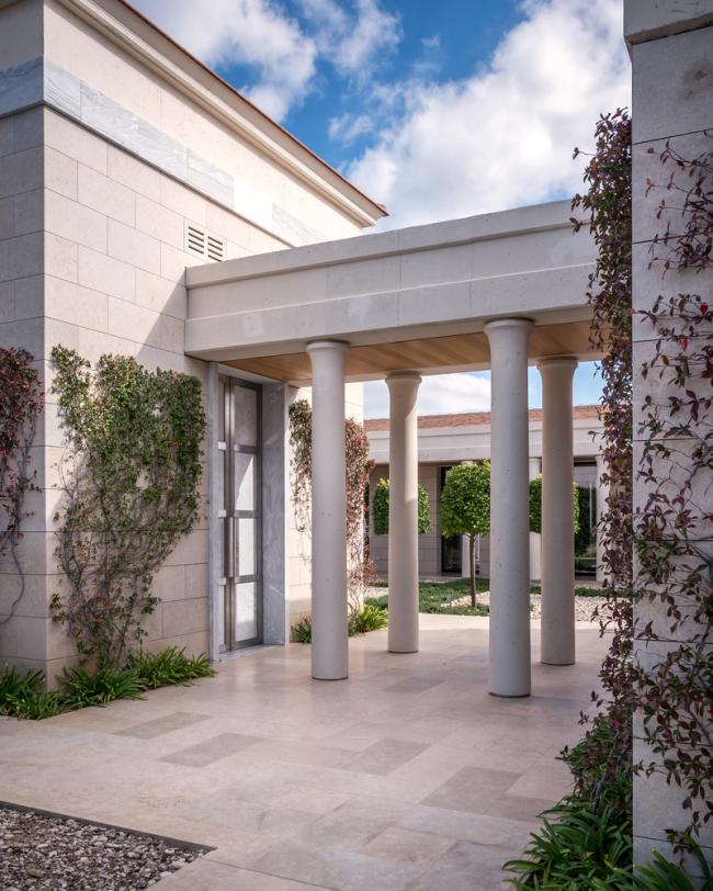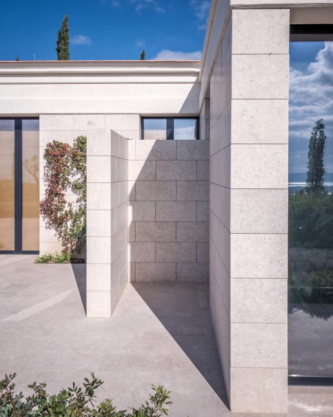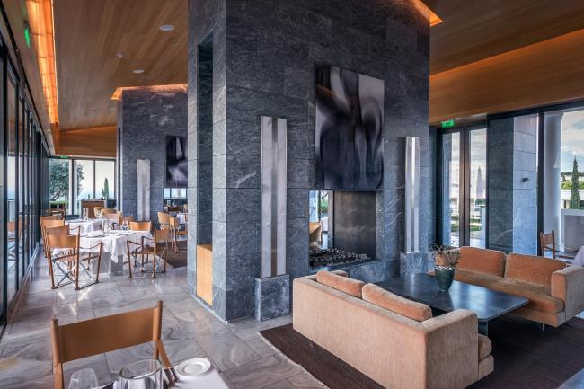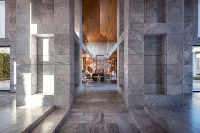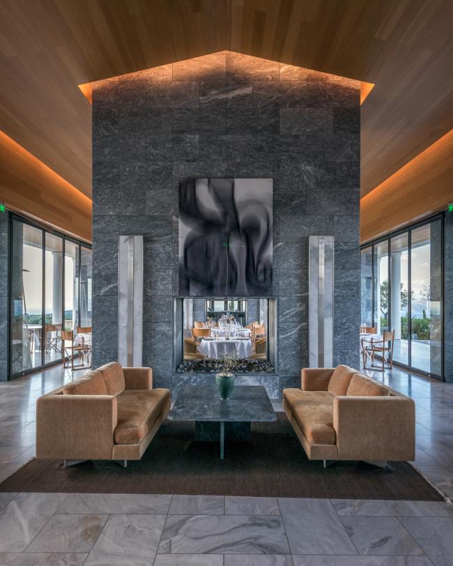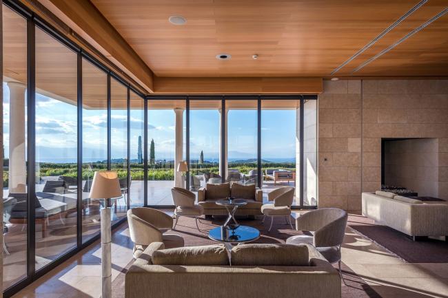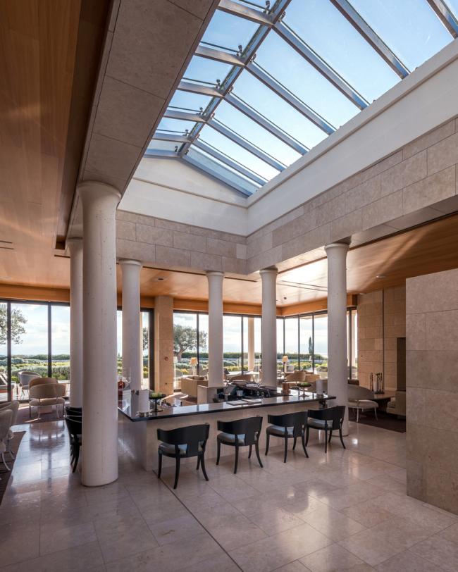 塔特尔的设计灵感来源于经典的希腊建筑,其建筑形式能够获得最佳的景观视野,以优美的柱廊支撑上方的平屋顶,为一览无余的全景视野创造了完美条件,同时在外部和内部之间的空间建立了流动而开放的氛围。室内空间的高屋顶冷色调材料(比如大理石和天然石材)通过温暖的橡木木材进行调和。
