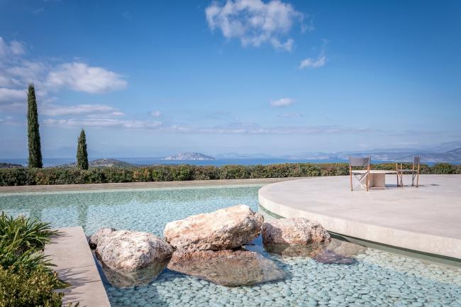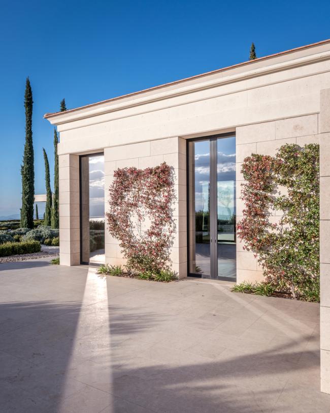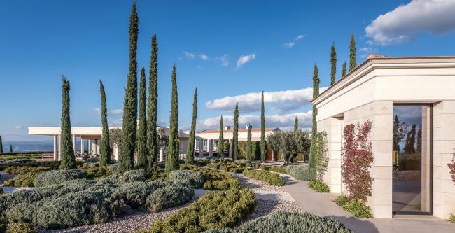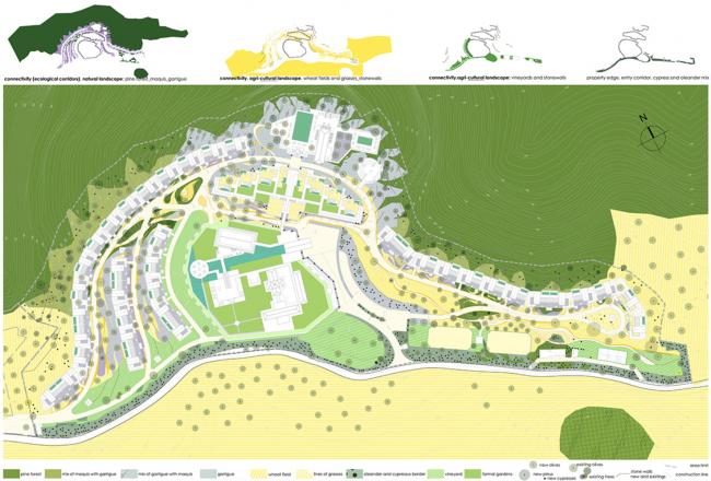 景观设计确认了现有景观的要素:松林、马奎斯和弗里加那芳香植物、古老的橄榄树和胡罗卜树、葡萄园、麦田和农用石头墙。这些元素在度假胜地被重新利用起来并塑造出各种各样的空间品质,从精致到狂野,从唯美到豪放,其营造出大量的体验氛围。使用者行走其间会有一种依偎在自然怀抱中的感觉,仿佛已经成为自然的一部分,而不仅仅是在远处看着它。