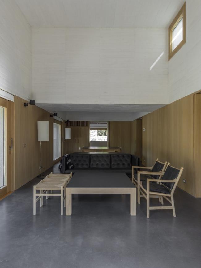 每个立方体空间包含两层:低层以橡木板覆面,用于安置建筑的服务功能;高层以白色混凝土通饰。在房间内通过方形橡木窗向外望去可以欣赏外部风景。建筑后方的开放平台上有个泳池。