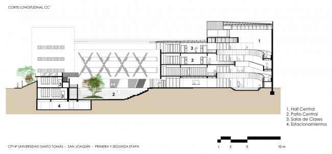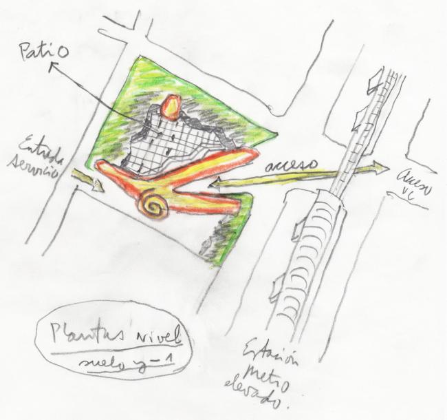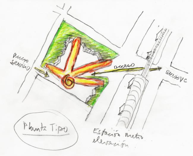 项目地块位于繁忙的VicuñaMackennaAvenue大道的一角,高架地铁在该大道上忙碌的行驶。位于该场地前面的是智利最重要的大学之一的最大的校区。它主要的入口通道位于SantoTomás专业学院的对角线上。另一个重要的需要回应的问题是这个150米长的地铁站存在所带来的压迫性,立于场地前面高为4层的建筑体量。唯一的视觉上的兴奋点是在现场的角落内一点,恰好在刚刚所(BIM)提到的对角线上。所以设计师因此决定在该轴上设置进入该研究所的主要入口。