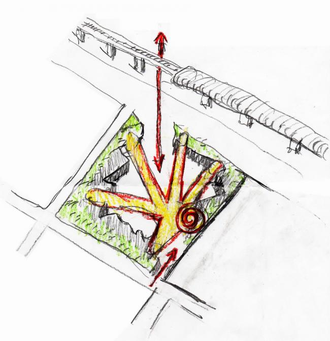 在这样的一个无序社区和周边环境下注定不是一般方案能够解决的问题。所以我们决定将新建建筑与混乱的环境分开,形成一个可以步行的绿色周边路堤。在堤岸下面会有一系列的教室空间朝向建筑内部方向。这些绿植堤道只在上述所说的主要入口处断开,其余都是连接在整个建筑体量的周围。