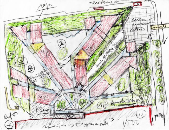 作为一般方案来讲,设计师都会选择一种有效且经过多次验证的解决方案。这种结构形式颇有“手指”意味的结构,能够营造出开放式庭院的感觉,并且使建筑物能够接收东部,北部和西部各个朝向的太阳光照。“手指”有助于将建筑分成不同的阶段时期。在面向对角线的建筑物之间,布置设计了带有攀缘植物(ampelopsis)的长格状入口形式。“手指”延伸出去的末端都带有绿植,保护这些外墙不受噪音和阳光的影响,将它们与堤道在某种关系上联系在一起。