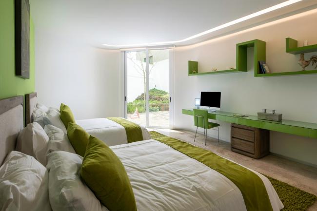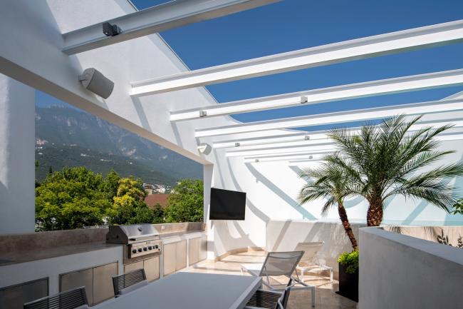 每个空间都通过建筑室外的一个花园连接起来,在这个室外花园里的颜色和质感都与室内的家具相呼应。BGP设计了室内外应用钢铁,藤条和木头,保持室内外统一。别墅的入口通过(BIM建筑)中间层,其中包括了位于家庭影院之外的客厅和餐厅,通过开门和关门可以成为一个独立的空间。
