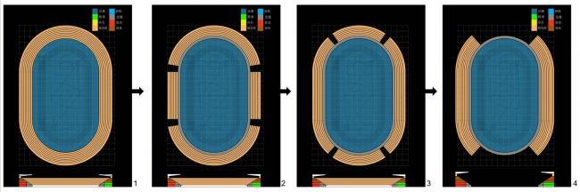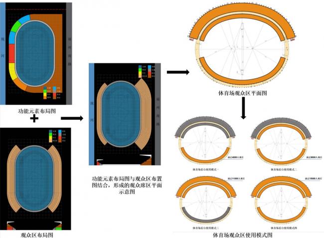 本设计结合“空间效益”理论,首先对建筑内部不同功能元素进行分析、组合与对比,形成对体育场馆功能组织模式的优化,并发展出兼具灵活性和效益性的“复合化”的功能体系。同时功能体系的提升也引发了建筑面积的有效缩减,并演生出 “以小建大”的设计可能。其次结合体育建筑建成后奥运使用要求,将专业性与多功能性进行综合考虑,扩大了体育建筑的使用外延,也为体育建筑日常性使用奠定基础。