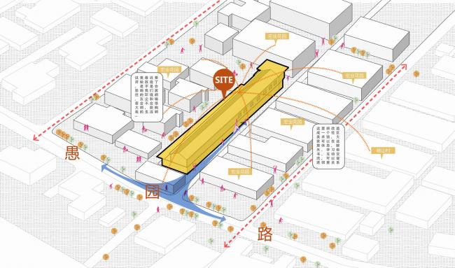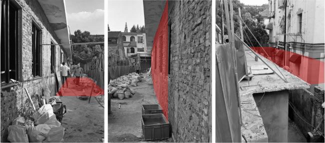 在开始设计前,首先要对场地有足够的了解,建筑由外渗透进小区内部,周边城市机理紧凑排(BIM)布,北面9幢为联列式假三层花园洋房,南面为独立花园式住宅,所在园区现为创邑SPACE联合办公空间,东面为久安坊,旧式上海里弄,场地周边的每一栋建筑都能讲述一段故事,走在愚园路上能够很深切的体会到历史在这里留下的印记。设计师多次来到现场考察,在考察过程中发现的问题以及对社区文化的思考成为了后续方案中最核心的部分。