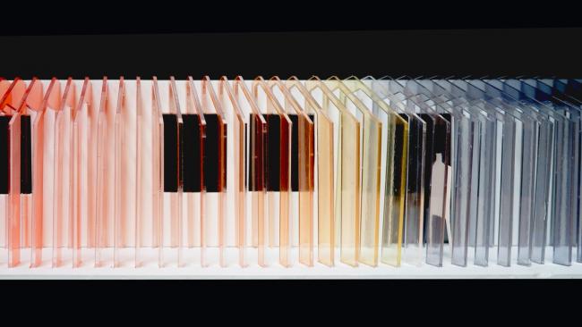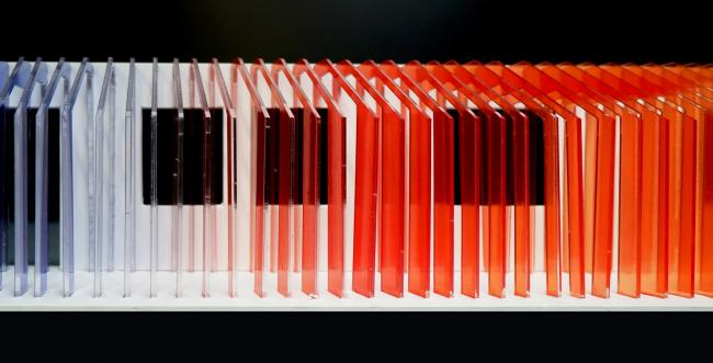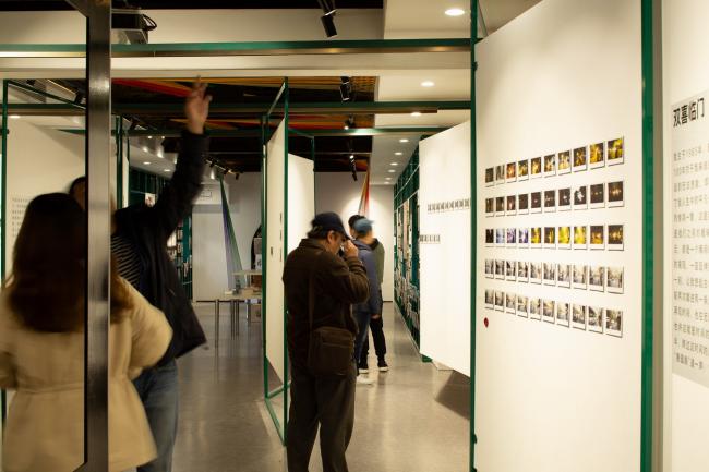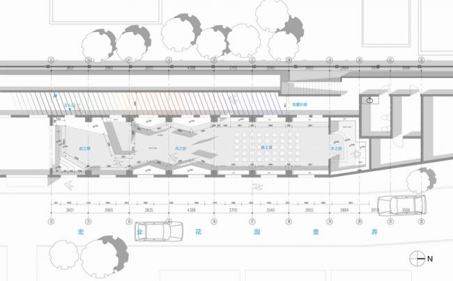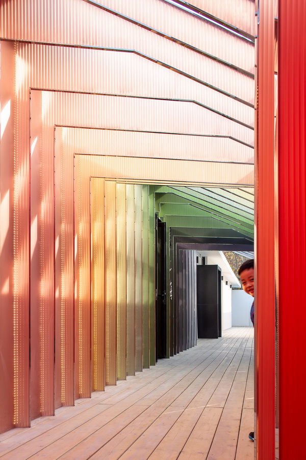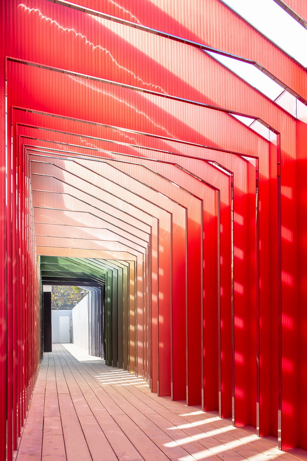 泼墨长廊,它既是建筑结构的一部分也是一个装置艺术,在选材方面,设计师对比过不同的材料:亚克力、钢化玻璃、阳光板,综合造价和设计效果,最终选用了阳光板,它的优势在于廉价且加工方便,对于预算有限和紧张工期的美术馆来说最合适不过。