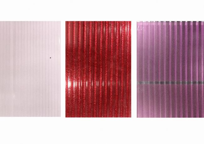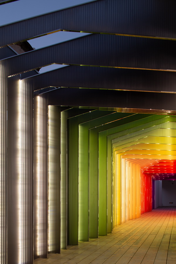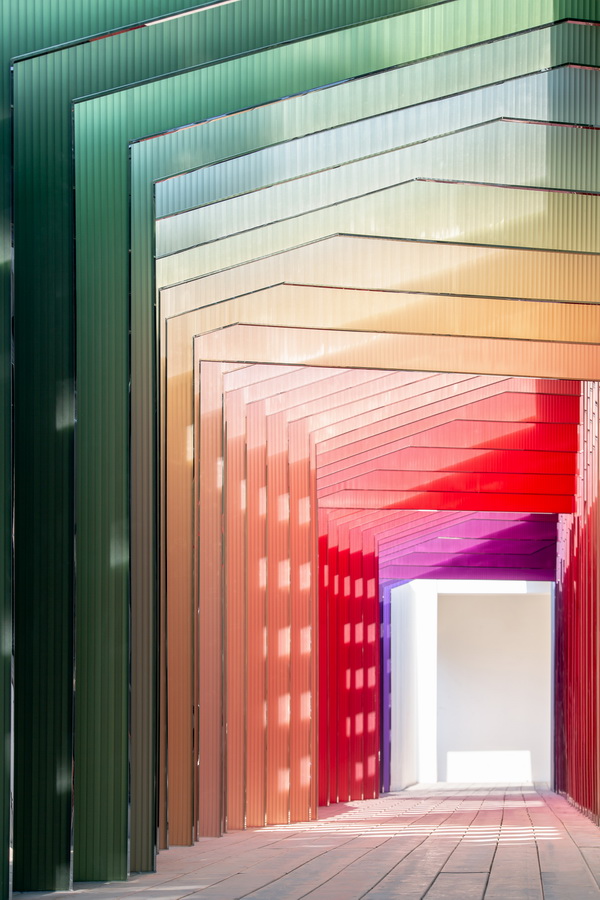 选材上色:方案确定后接下来就是考虑如何实现,阳光板本身是透明材质,但是我们希望达到的是多彩的效果,并且还要保证一定的透明度,在与供应商和施工队的沟通中,我们尝试了几种方法:1、选用自带颜色的阳光板;2、喷漆上色;3、贴膜上色