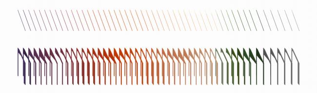 彩绳作为一种线性材料,具有一定的视觉导向作用,在空间上,设计师以线构面的手法,通过旋转,转折,交叠,使二维的面成为三维的体,具有了一定空间概念,旋转后的面在不同角度看时会有不同的视觉效果,达到横看成岭侧成峰,远近高低各不同的艺术审美。