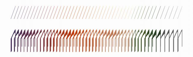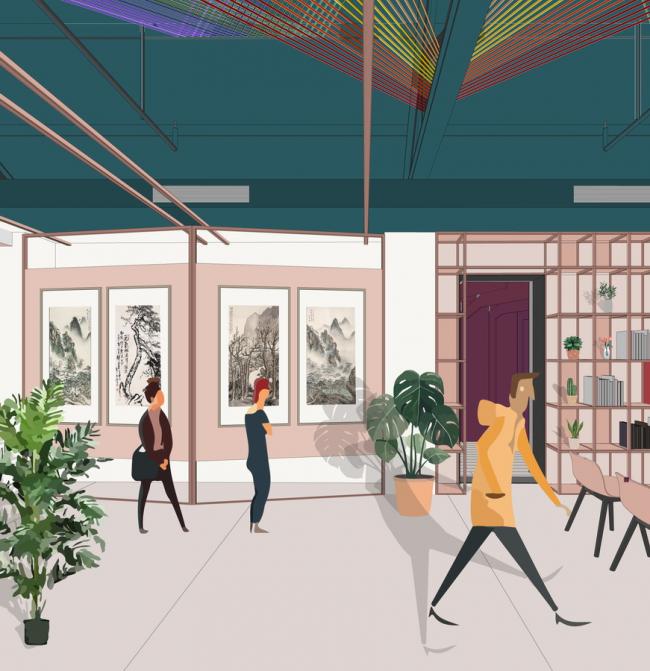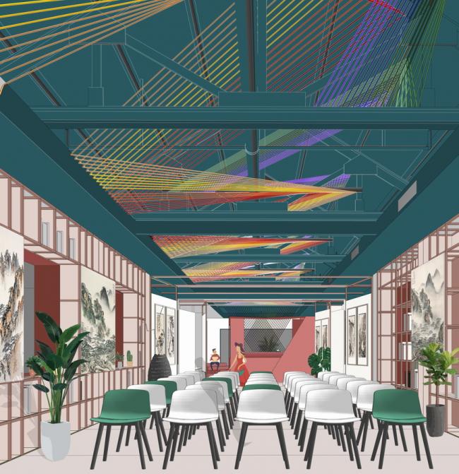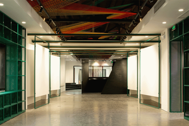本项目是与刘海粟美术馆联合推出的社区型美术馆,海老晚年多画泼墨,描绘的黄山气势恢宏,笔法硬朗,因此设计师从海老的黄山画作中提炼出中国传统色彩,用现代手法重新演绎,致敬海老。