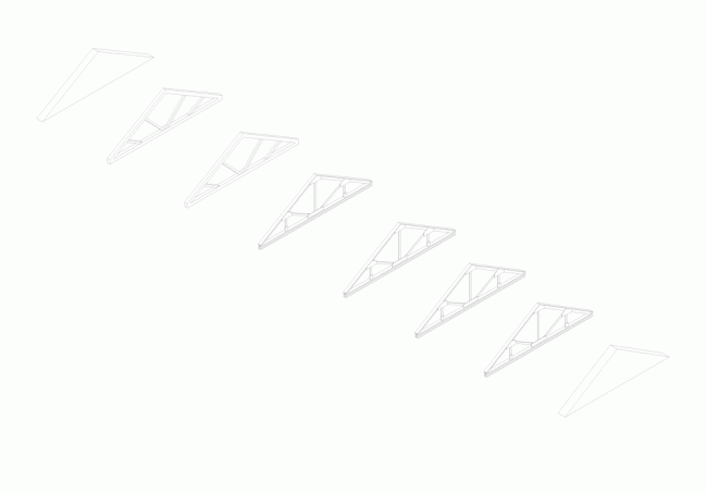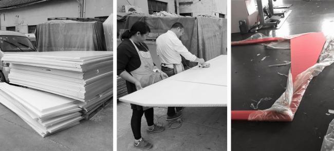 没想到搭建的第一步就碰到了问题,由于板材尺寸过大(2000*3000mm)找不到合适的机床进行切割,最后协商只能人工手工切,设计上共有50片阳光板,每一片的形状都不同,人工切割一天最多切10块,原本预计2-3天的加工期现在要延长至一周,得知这个消息,设计师立马对方案进行调整,将板材重新分类,统一模数,最终统一13片为一个完整周期,大大压缩了加工时间。