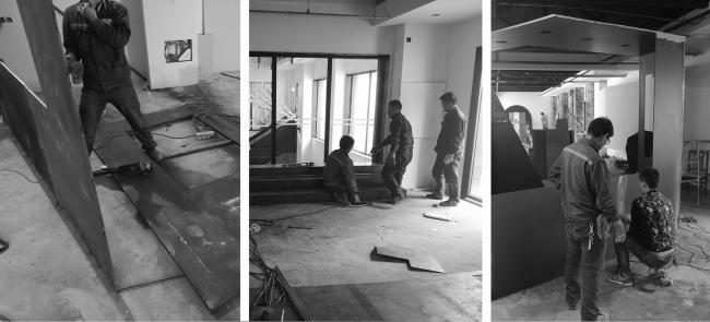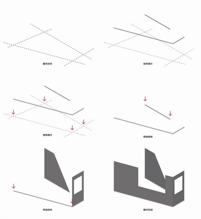 看似简单的构造,在实际操作中却也是困难重重,材料采用的是一厘米厚的钢板,在无外力作用下要让它能够固定住,需要对连接点进行研究,分析受力点的位置该如何定位,最终采取的方式是在地面埋好U型预埋件,将钢板的重力分散到地面,同时钢板自身有几个稳定的固定点。