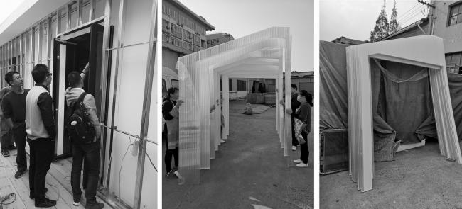固定:泼墨廊道的上色问题一解决,基本上就算是搭建完一半的工程,剩下需要做的就是阳光板如何固定,走廊是露天的,而上海梅雨季节雨水多且风大,阳光板可供固定的点位只有两侧的墙体,其中一侧是由龙骨搭建出来的假墙,另一侧墙体又歪斜不平,在这样的情况下如何保证阳光板的安全性,这又给我们出了一道难题。