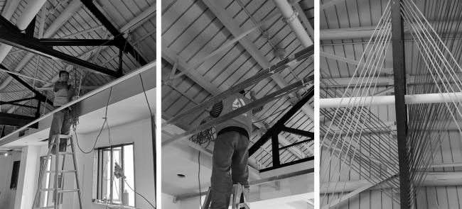 设计彩绳遇到的最大的难点在于绳子的走向和固定,由于屋顶上结构紊乱,管线复杂,要在一团乱麻中理出两条明确的走线,且互不干扰,让设计师绞尽脑汁。