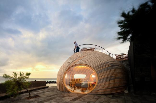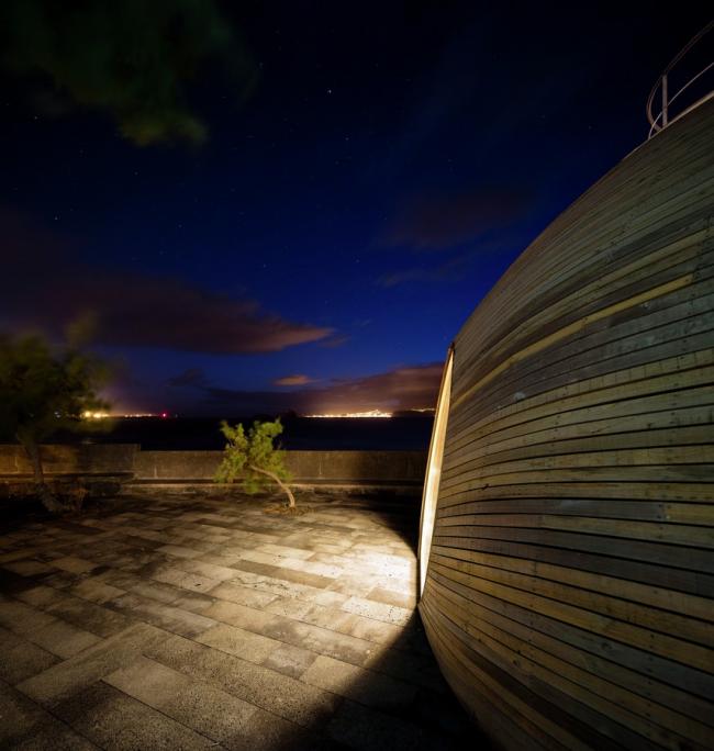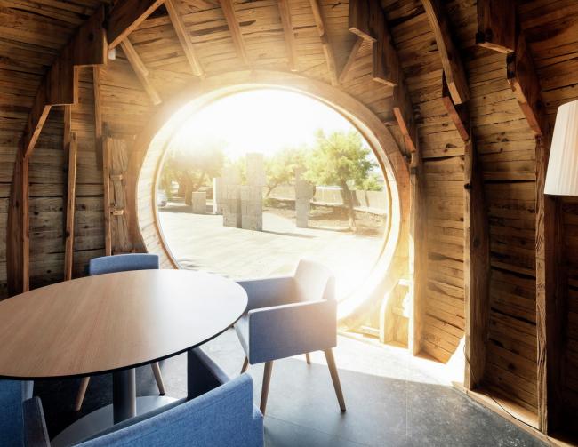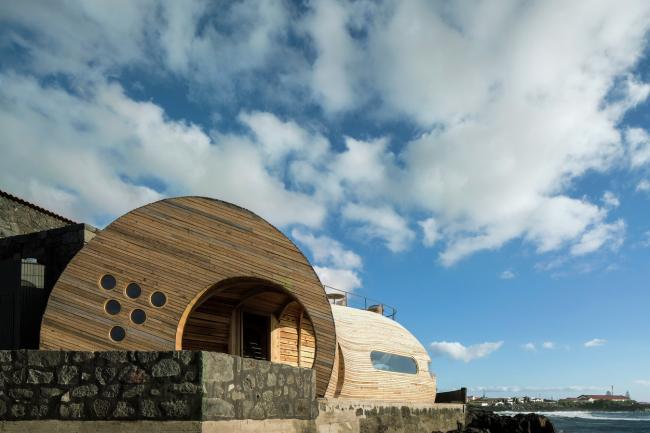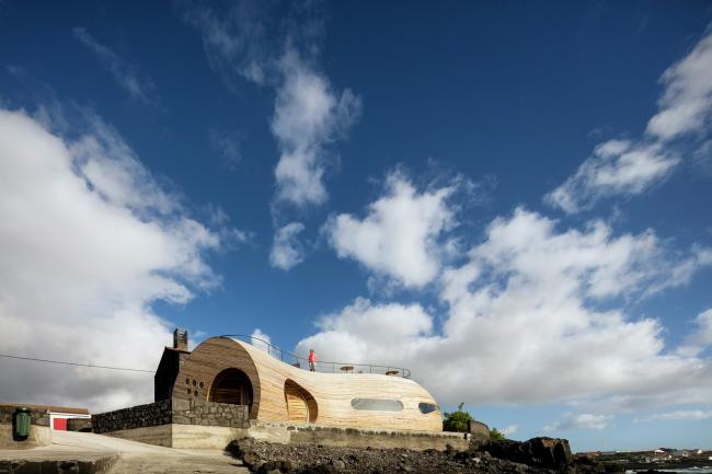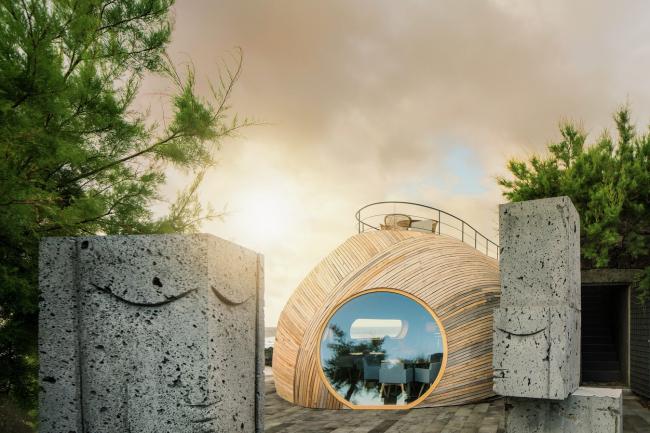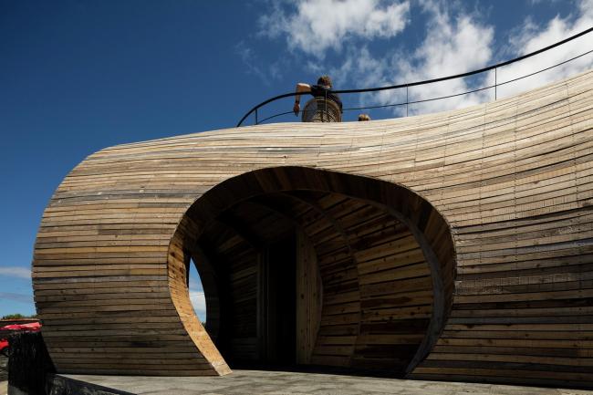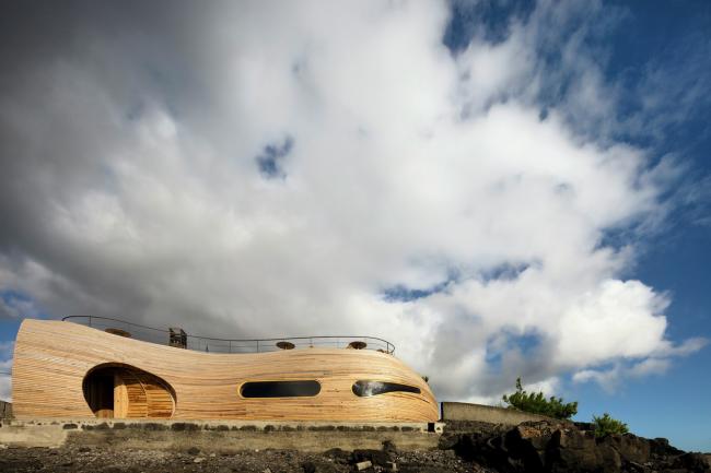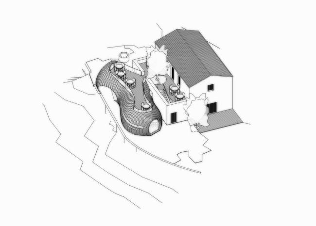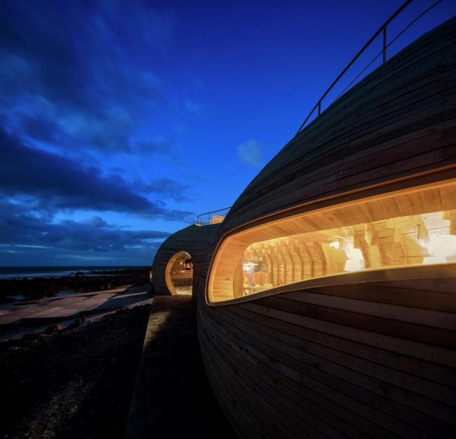 在建筑设计的初期定义,在体量形状和材料选用方面具有很大的可塑性,并且受到场地周围自然环境的显著启发。比如该建筑的形态组织中存在该环境的几个特征,包括周边环境的岛屿轮廓,岩石的抽象化,鲸鱼体态和葡萄酒桶的的拟用。