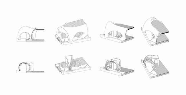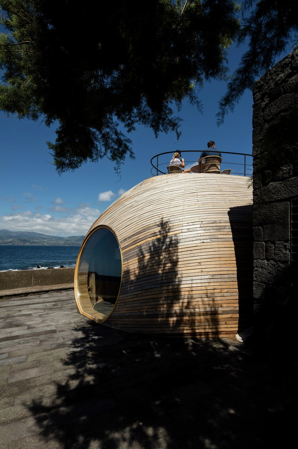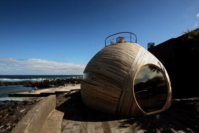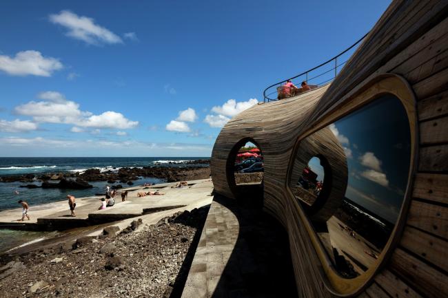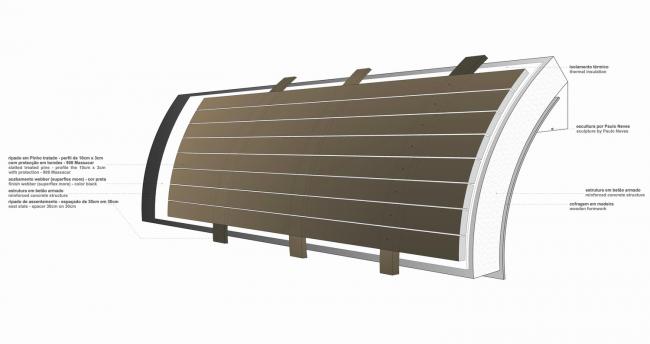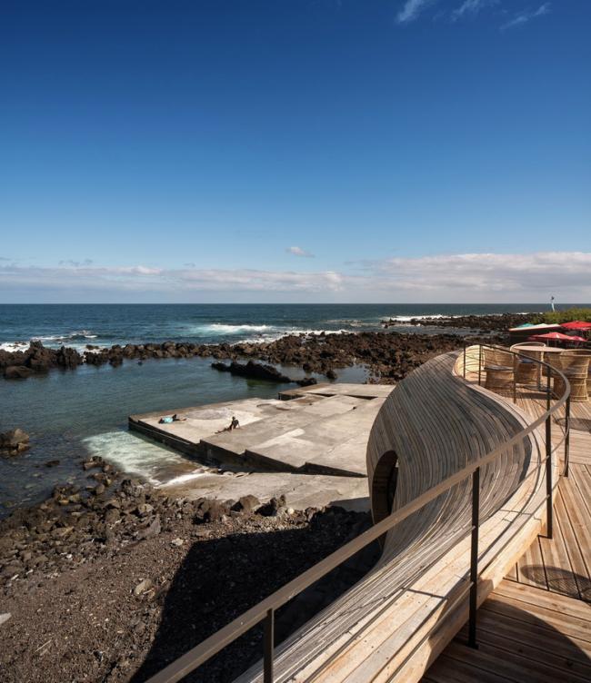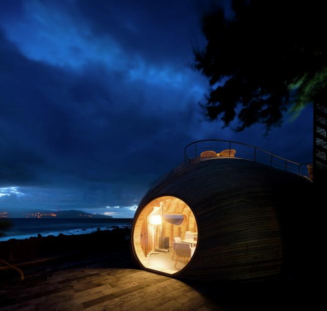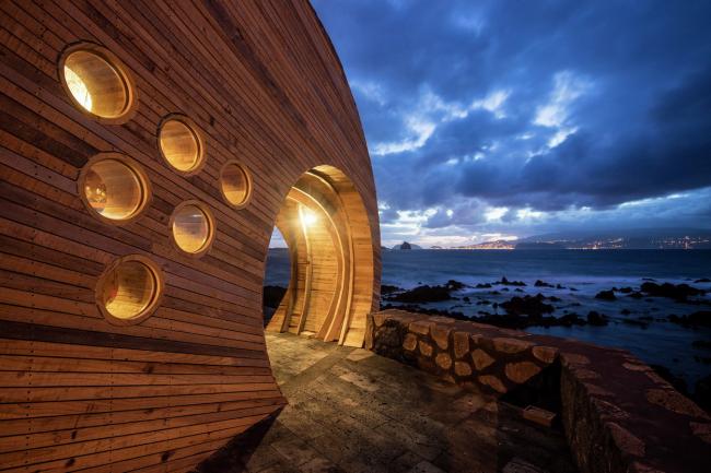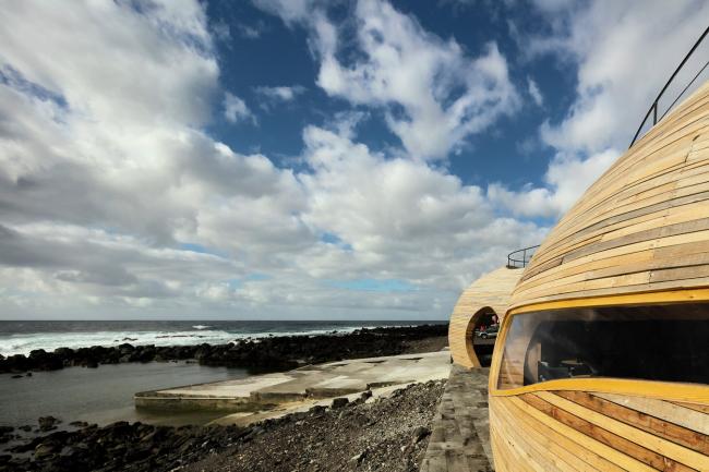 在建筑设计的初期定义,在体量形状和材料选用方面具有很大的可塑性,并且受到场地周围自然环境的显著启发。比如该建筑的形态组织中存在该环境的几个特征,包括周边环境的岛屿轮廓,岩石的抽象化,鲸鱼体态和葡萄酒桶的的拟用。