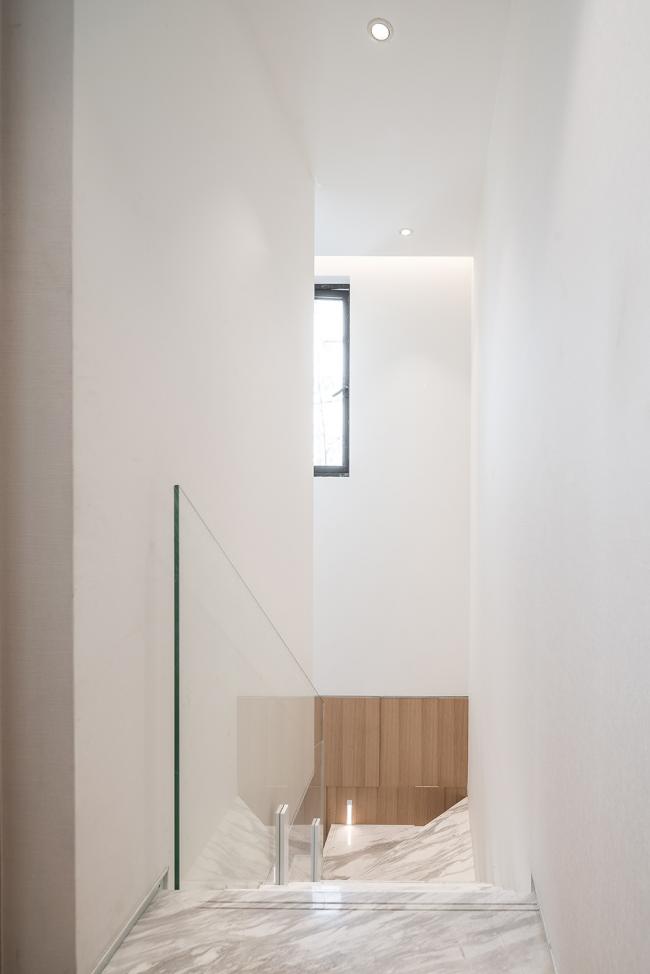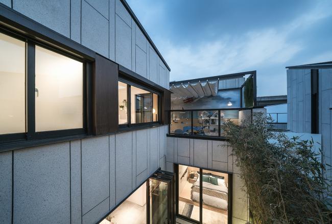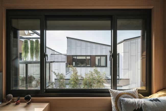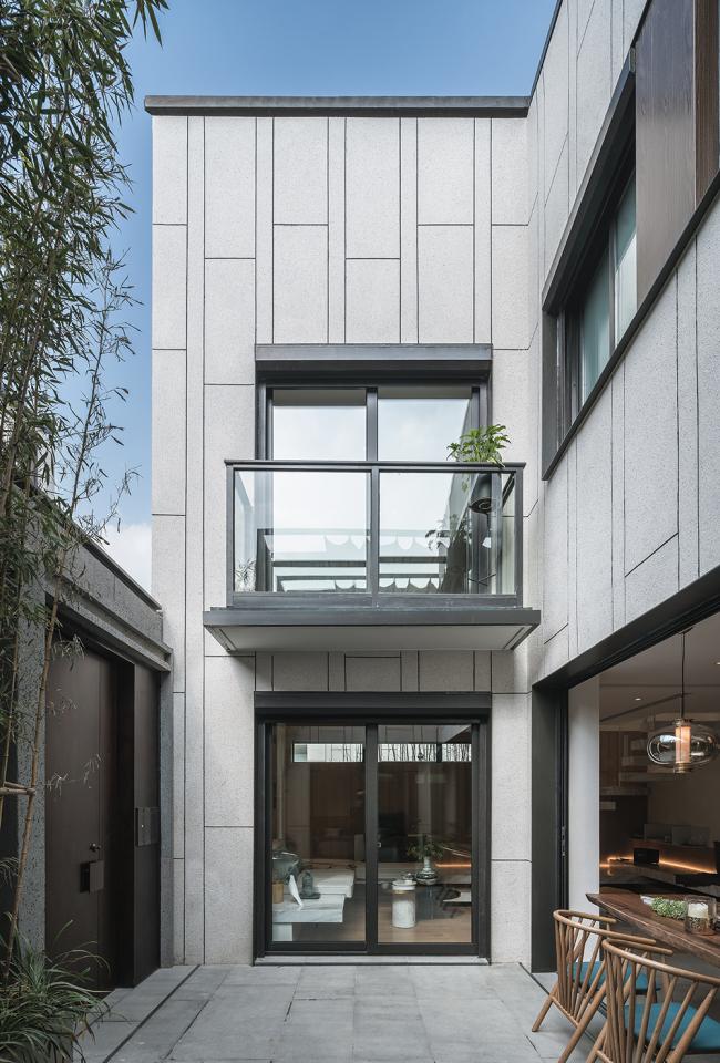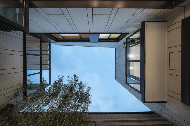 “白色生绢,亦名为素”。建筑主体采用素色仿石涂料,恬淡朴素。竖向的竹节拼缝疏密有致,让建筑多一分细致。错落起伏的屋檐是这个建筑的精神,我们用挺拔的暗灰色铝板加以提炼概括。窗间点缀木纹转印铝板,温暖的木色让建筑不至冰冷。局部采用灰色洞石,斑驳的洞石是一种颇有水墨意境的材料,以8mm钢板收边,自然的肌理与硬朗钢板相互碰撞,理性与感性相映成画。