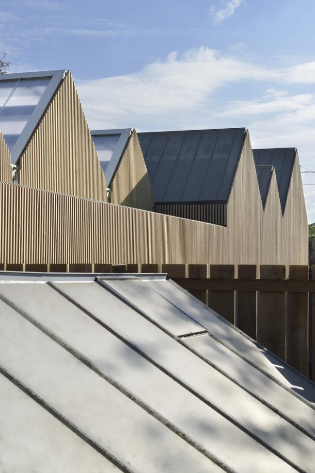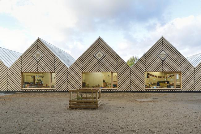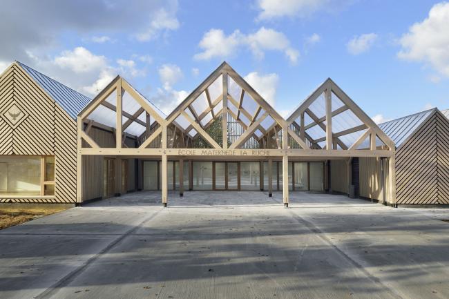 整个项目在施工过程中有意识地减少了一些不必要的步骤,使得整个学校在十个月的时间里快速建成。该项目所在的城市是区域自然公园的一部分,这个公园将会引领着整个学校以高环保性能为目标完成。建筑体量的框架结构和外立面均采用木材,其线性布局创造了一个宽敞的区域,能够有效激励人们延续在旁边购物中心和幼儿园中步行的意识和行为。